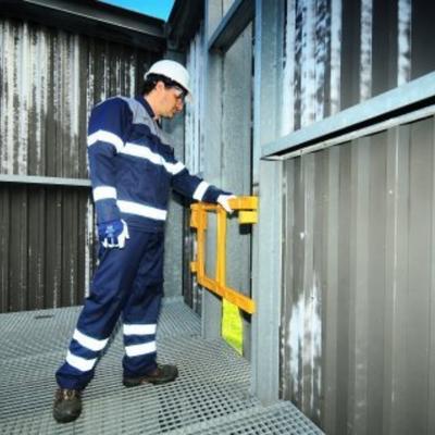 CAUTION: Old fashioned flip-over / drop-down gate mechanisms can become dropped objects. Self-closing gates such as the CableSafe Intrepid Safety Gate eliminates this hazard and would be recommended where practicable. CableSafe Safety Intrepid Gate is TÜV Tested.